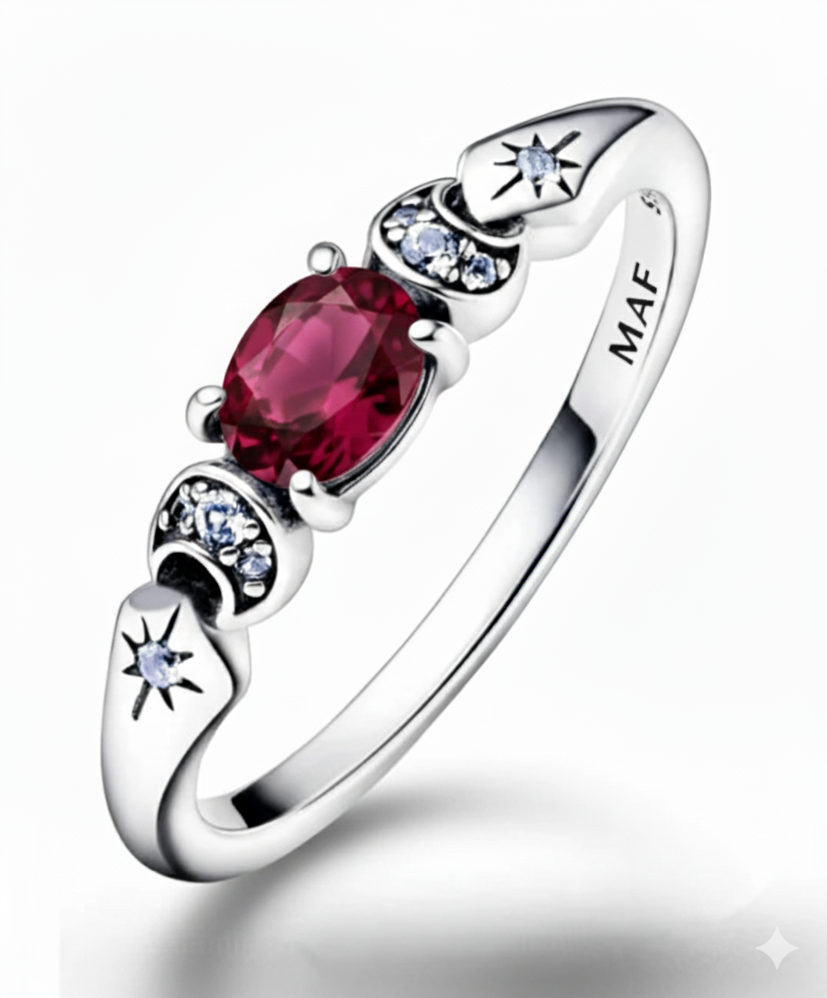 Sumérgete en el misterio y la pasión con nuestro Anillo «Poison Red». Esta exquisita pieza, elaborada en plata pulida, presenta una deslumbrante gema de rubí ovalada que captura la luz con un brillo intenso y seductor. A cada lado, detalles intrincados con pequeñas circonitas y estrellas grabadas añaden un toque celestial y enigmático.