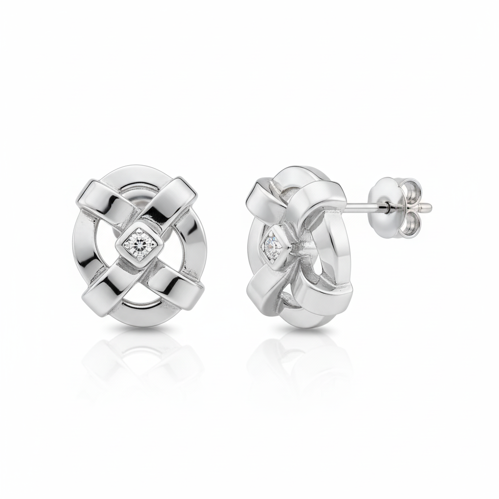Adorna tus oídos con la modernidad y el equilibrio de los ‘Geometric Harmony Studs’. Estos aretes de botón presentan un diseño vanguardista, con un patrón entrelazado que crea una ilusión de movimiento y profundidad. Elaborados en metal pulido y brillante, con un sutil diamante incrustado en el centro, capturan la esencia del diseño contemporáneo. Su forma abstracta y limpia los convierte en el accesorio perfecto para complementar un estilo sofisticado y audaz