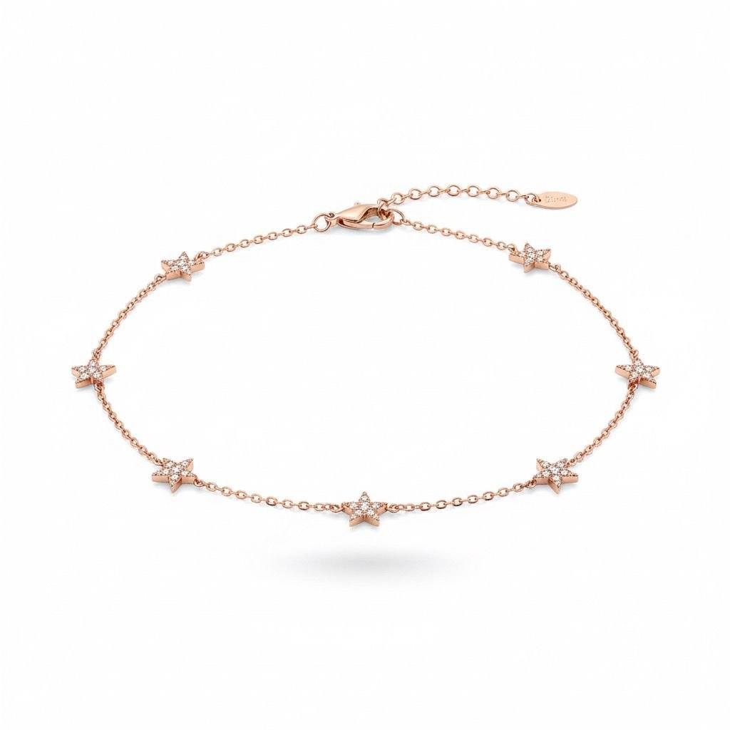 Esta moderna y elegante gargantilla de oro rosa presenta una delicada cadena de eslabones finos. A lo largo de la cadena, se distribuyen pequeños motivos en forma de estrella, cada uno engastado con un diminuto diamante que capta la luz.